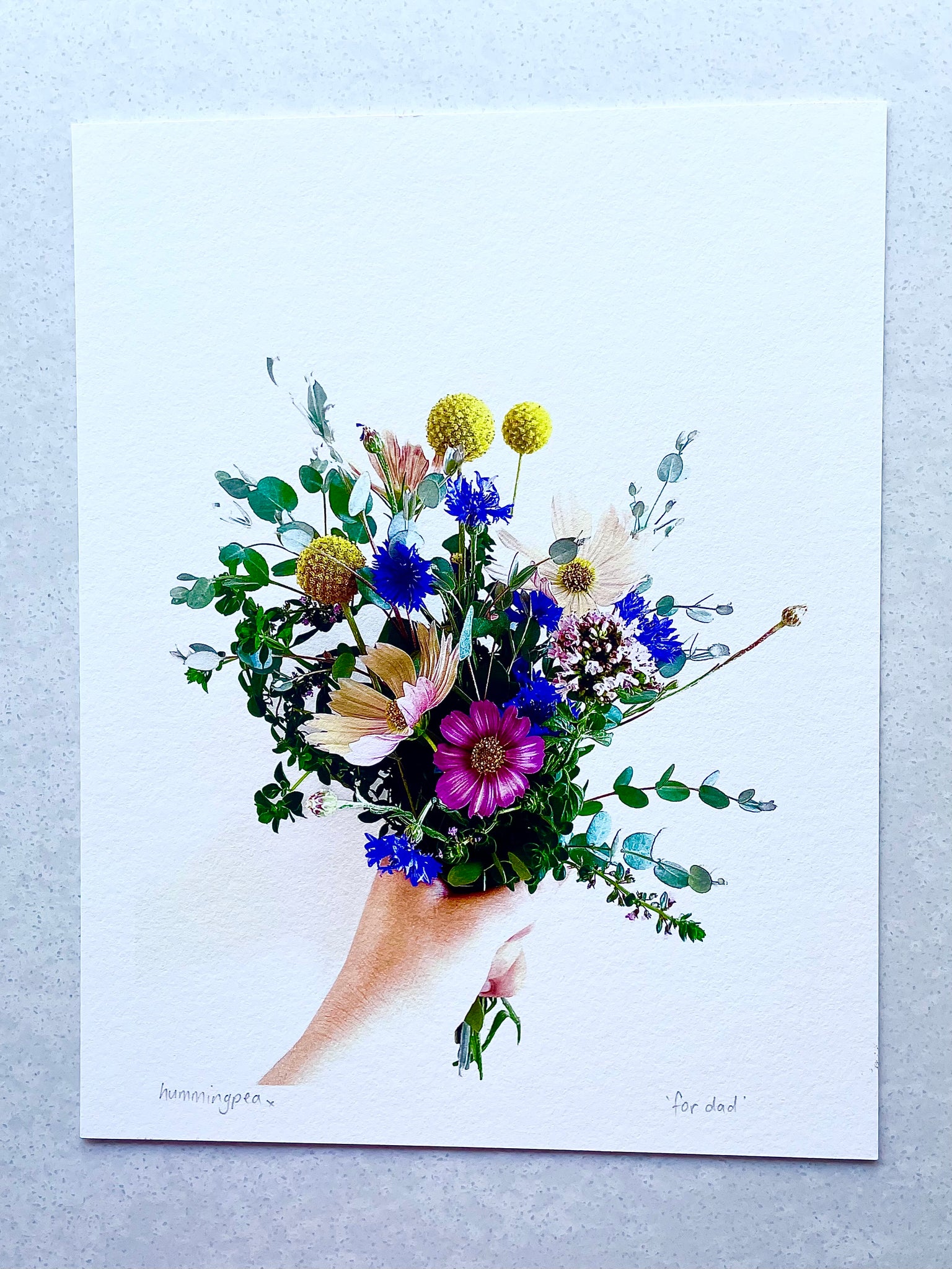 This print shows a posy of wildflowers; cosmos, billy buttons, cornflowers, rosemary, thyme and baby silver gum, collected in memory of my Dad.
